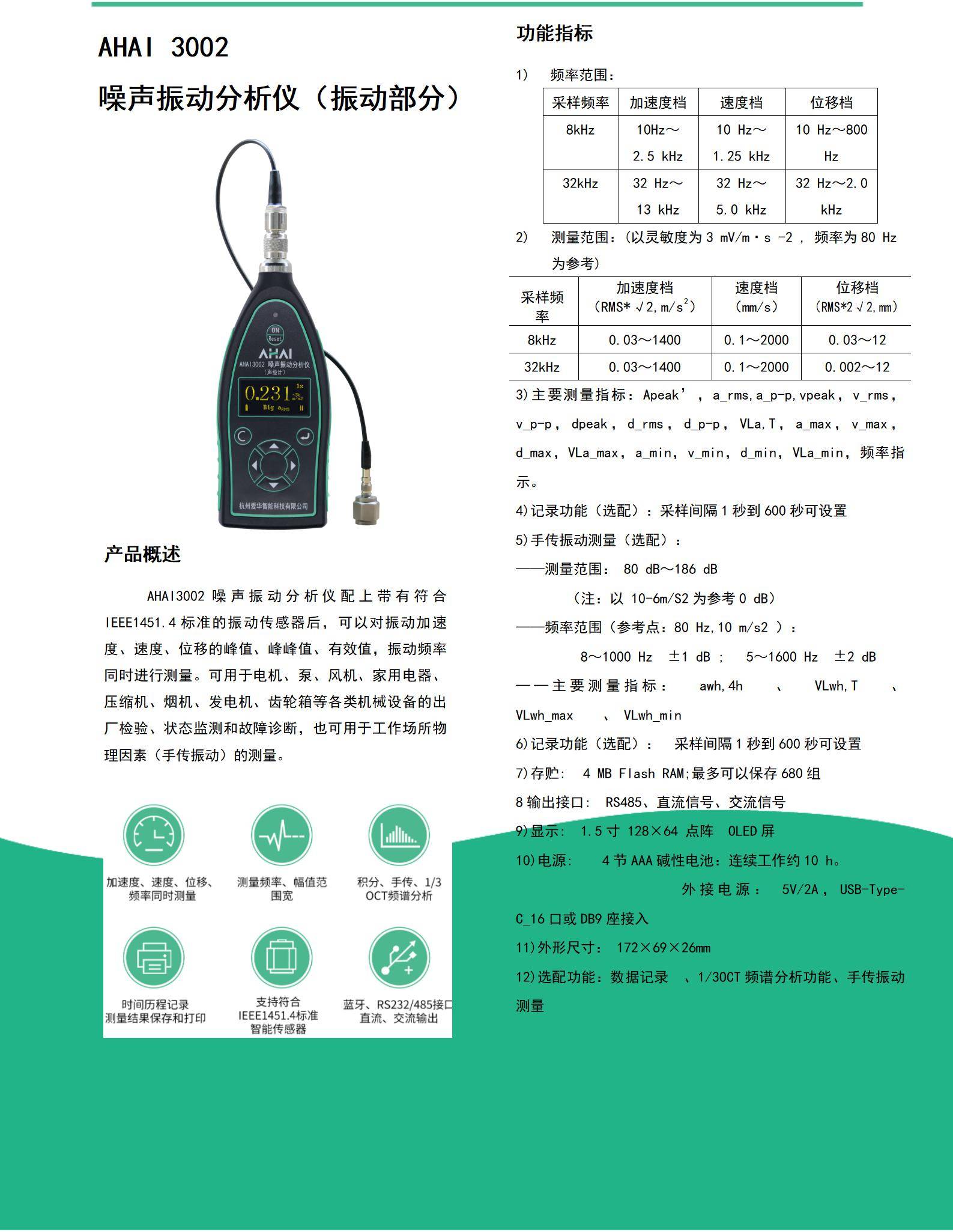 AHAI3002噪声振动分析仪 声级计工作测振仪 振动加速位移频率测量