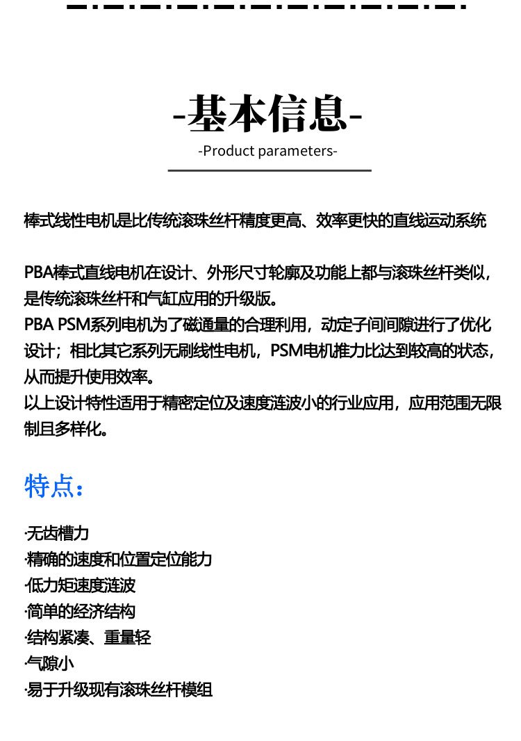 PBA棒状直线电机内置编码器高精度PSM系列管式无铁芯电机