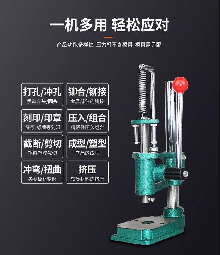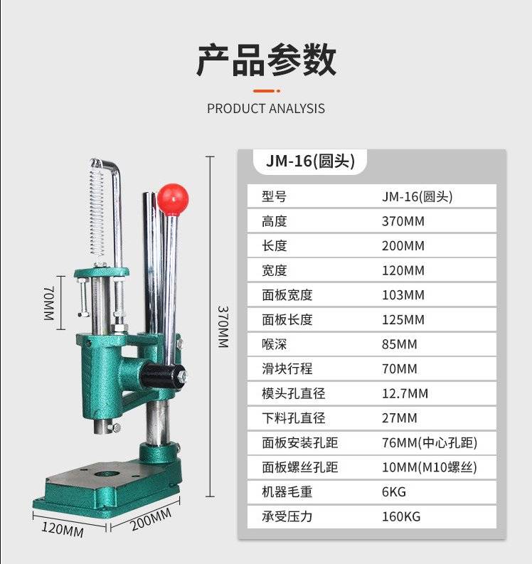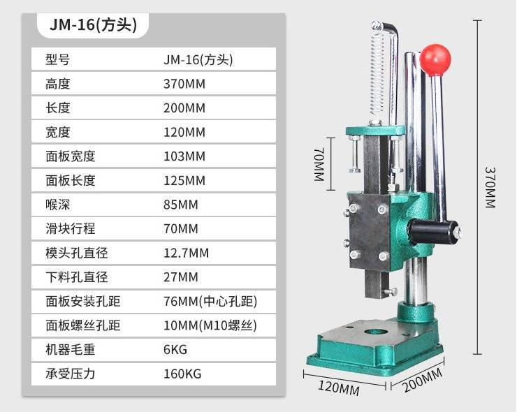 型号;JM-16 方头 圆头 多种型号可咨询布局形式;立式喉口深度;85(mm)适用范围;通用控制形式;人工用途;打孔/冲孔(手动方头/圆头)铆合/铆接(金属部件的铆接 )刻印/印章 (符号、标牌等刻印)压入/组合 (精密件压入组合 )截断/剪切(塑料塑胶截切)成型/塑型 ( 产品的成型 )冲弯/扭曲 (各类板材变形 )挤压 (软质材料的挤压)