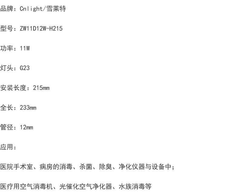 雪莱特紫外线杀菌灯医疗消毒机用单端H型11W