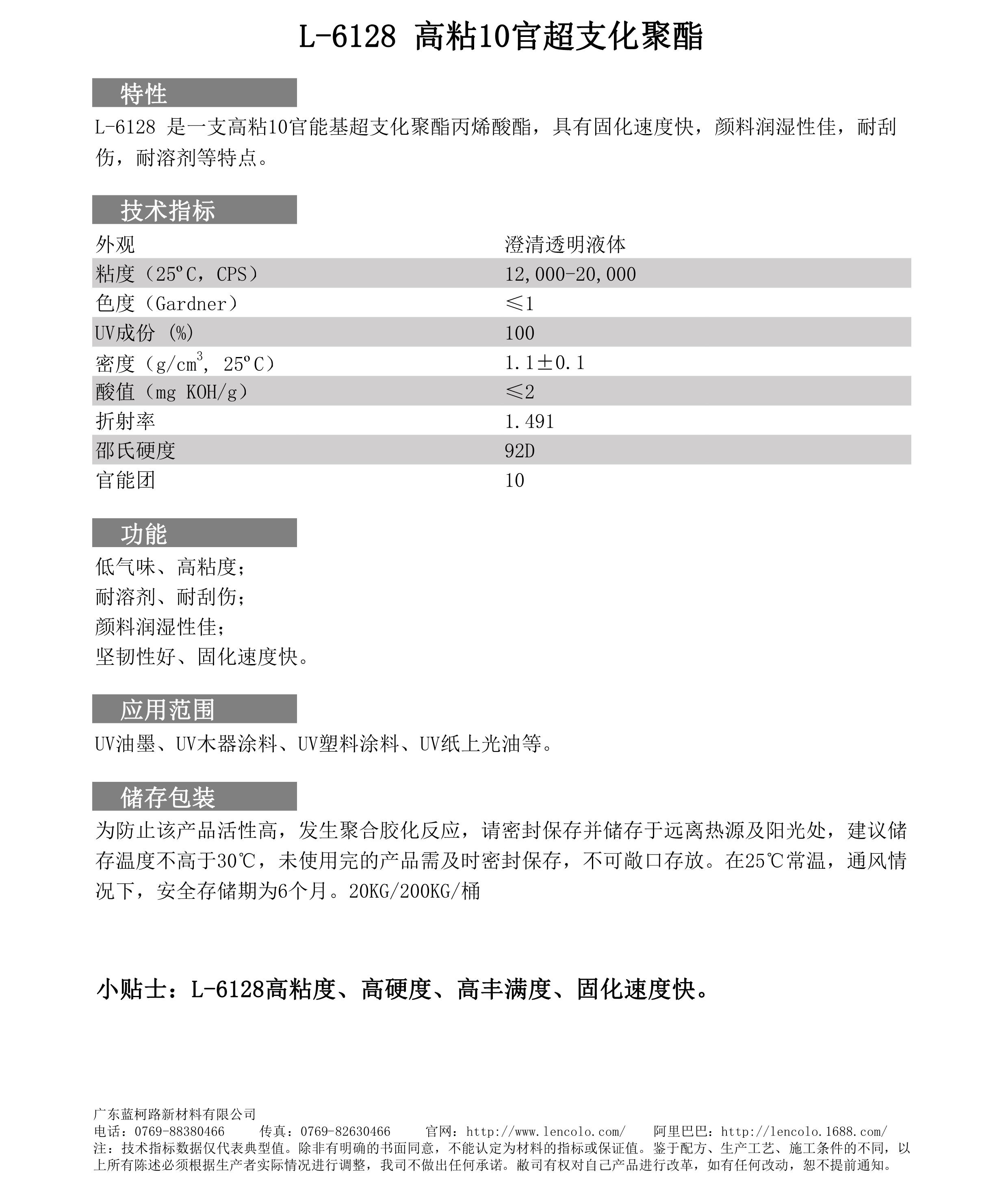 蓝柯路L-6128 聚酯树脂 高粘度UV树脂 油墨 木器涂料 塑料涂料