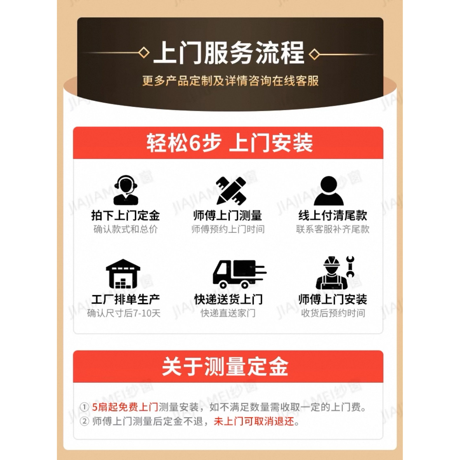 预付上门定金/可抵货款,尾款/配件